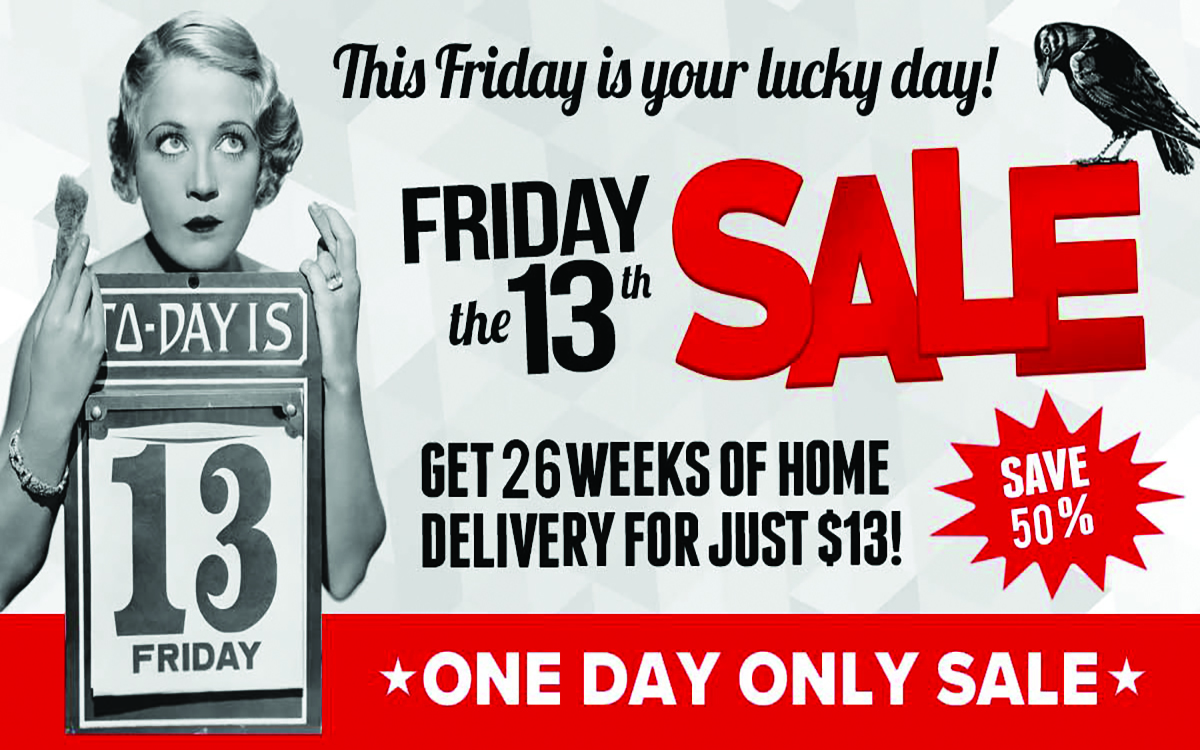 To take advantage of this special offer, sign up at //www.yazooherald.net/YH-friday13sale. You can also stop by the newspaper office at 1035 Grand Ave. between the hours of 8 a.m. and 5 p.m. on Sept. 13 or call 662-746-4911 to pay with a credit card or debit card.