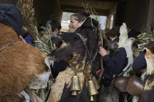 Clad in sheep and goatskins with heavy hand-forged bronze bells chained to their waists, the Bell People danced through the streets Monday of this red-roofed village, a two-hour drive northwest of Athens.