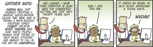 Darrin Bell is transforming his strip “Candorville” — which usually features young Black and Latino characters — into a way to address Adams' racism by mimicking the look and style of “Dilbert,” complete with wayward necktie.