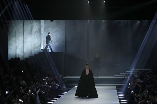 MILAN (AP) — Milan is ready to party, with menswear shows for next spring and winter focused on nighttime tailoring with playful accents. Think sparkles and glitter, fun silhouettes that invite shadow dancing, and sexy peeks at skin with tailoring tricks once reserved for the female wardrobe.