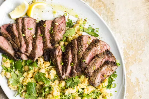 We then partially mash chickpeas and cook them in a skillet with chopped scallions. The warm salad is a perfect foil for the steak, which we sprinkle with a little more of the spice mixture after cooking it to double down on the flavor. A dollop of plain yogurt and warmed pita bread will round out the meal.