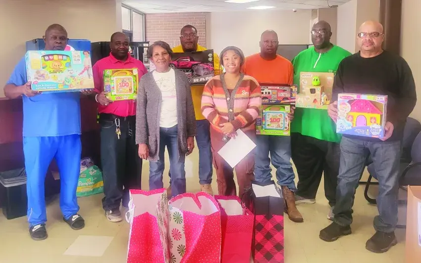 The 21 Club, Inc. donated toys and presents to the Mississippi Department of Child Protective Services during the holiday season. Pictured are, from left, 21 Club members Toney Williams, Kenneth Washington, Diann Thompson (MDCPS), Ricky Harris, Zakiya Harris (MDCPS), Michael Phillips, Joffre Washington, and Cherry Fox.