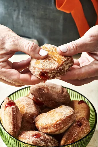 There are two ways to fill jelly doughnuts. You can fill them before frying (the jelly is sandwiched between two disks of yeast dough, sealed and fried). Or you can fry them first and then inject them with filling, which is what I do here. This technique removes the risk of not-properly-sealed doughnuts coming apart in the pan and leaking their filling.