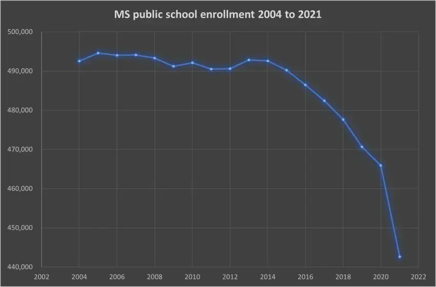 Enrollment in Mississippi public schools reached a peak in 2005, when there were more than 494,000 students enrolled. Enrollment has decreased every year since 2014, when there were more than 492,000 enrolled. Now more than 442,000 are enrolled after more than 465,000 were in public schools the year before.