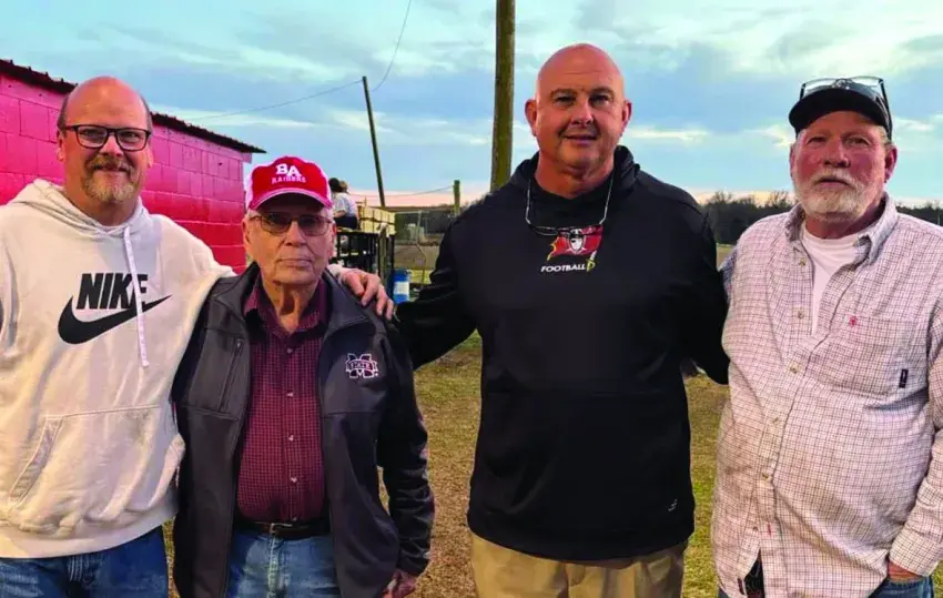 The first home game of the baseball season for Benton Academy was a special moment with the first pitch from dedicated fan, Joe Boggan Sr., who has cheered on the Raiders for generations within his family. Pictured from left are Chad Smith, BA athletic director, Joe Boggan Sr., Bryan Dendy, BA head of school, and Joe Boggan Jr.