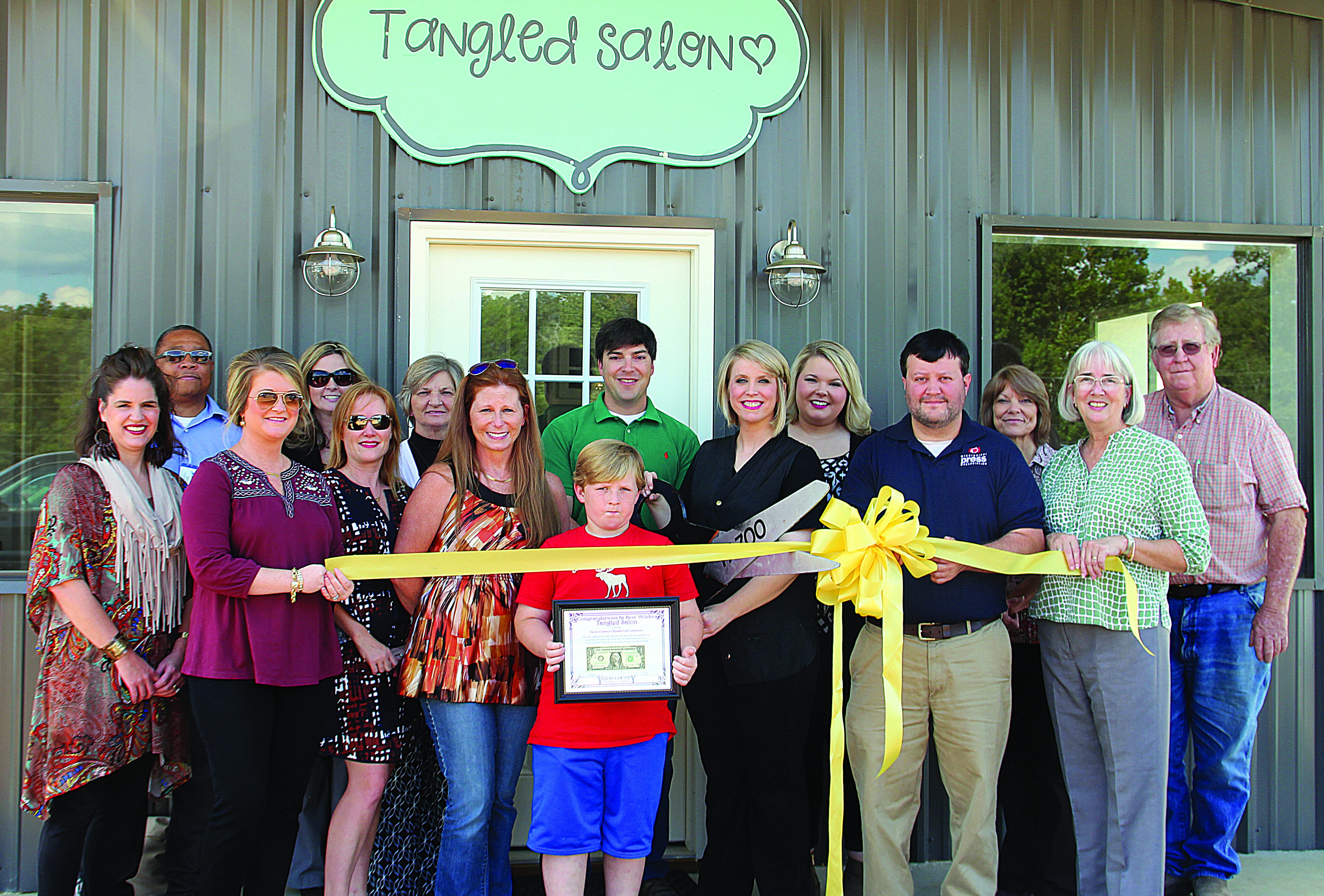 The Yazoo Chamber of Commerce recently welcomed Tangled Salon to the local business community. The salon, located on Highway 49 South, offers cuts, colors and styling, as well as manicures and pedicures and spray tan. Pictured from left are (front) Meredith Fancher, Erin Kraft, Jamie Swafford, Kimberly Denmark, Colton Howell, Crystal Greco, Jason Patterson and Pat Ellis; (back) Larry Williams, Whitney Hurt, Donna Kraft, Michael Greco, Becca Buxton, Barbara Greco and Austin Edwards.
