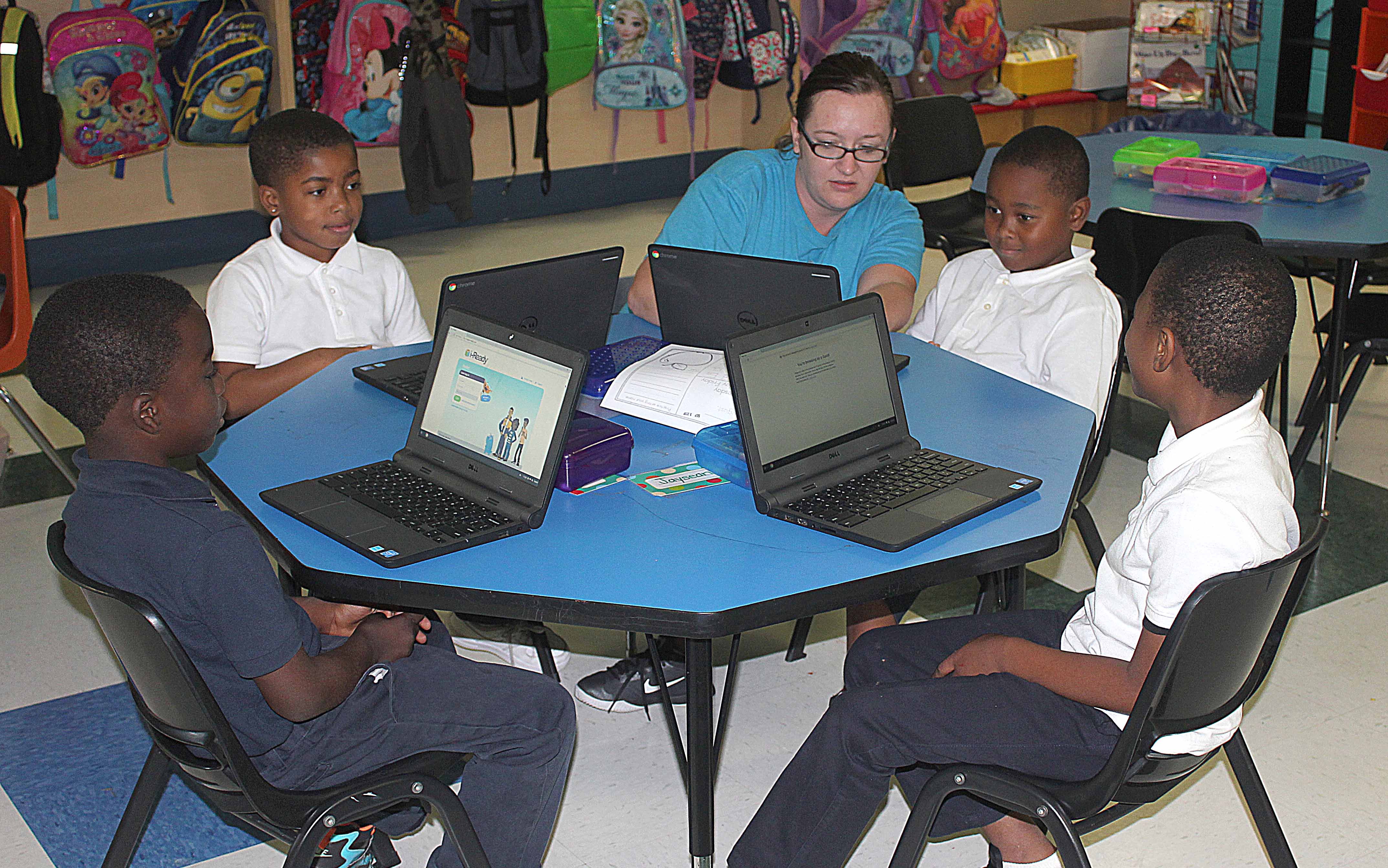 These kindergarten students learned computer skills as part of their curriculum to be able to complete their assessments. The teachers used data from those computer tests to change up the learning centers from day to day as needed to help students grow as much as possible.