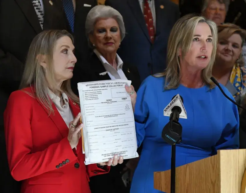 State Rep. Timaka James-Jones, right, holds a photo of her late niece, Harmony Ball-Stribling, during a press conference for Black Maternal Health Week at the Mississippi Capitol in Jackson, Miss., on Monday, April 14, 2025. Ball-Stribling and her unborn daughter, Harper, died in 2021 after a medical emergency in a rural community without 24-hour emergency care. James-Jones joined advocates in calling for improved maternal health policies across Mississippi. Credit: Eric Shelton/Mississippi Today