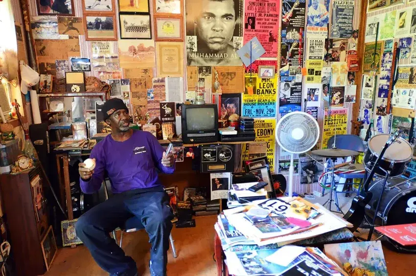 Terry “Harmonica” Bean of Pontotoc, inside a building on his property filled with memorabilia of his two loves, baseball and music, sharing a story from his glory days as a pitching phenom at Pontotoc High School. Credit: Vickie D. King/Mississippi Today