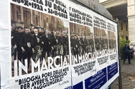 MILAN (AP) — Italy’s failure to come to terms with its fascist past has become evident as it prepares to mark the 100th anniversary Friday of the March on Rome that brought totalitarian dictator Benito Mussolini to power, a milestone that coincides with the country's first postwar government led by a party with a neo-fascist roots taking office.