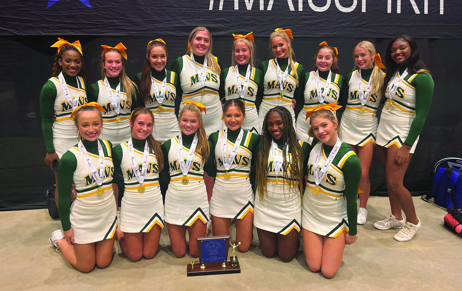 The Manchester Academy varsity cheerleaders were successful in bringing home trophies from the recent MAIS 3A Cheerleading Championships held in Jackson, MS. Pictured above, the State Champion varsity Manchester cheerleaders are, kneeling from left, Leilani Montgomery, Anna Riley Kelly, Rivers Wells, Ana Lee Ainsworth, Abby Crockett, Ella Posey Sanders; standing from left, Gabby Crockett, Anna Grace Ellison, Gracey Saxton, Ashley Newton, Simmons Bradshaw, Lexie Greenlee, Adalai Boggan, Annie Sandifer and Ryelin Levison.
