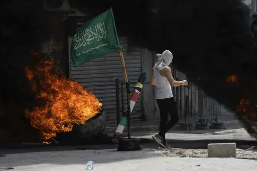 Masked protesters set up a replica rocket and a green Hamas flag as columns of acrid black smoke rose into the air. One Palestinian fell to the ground bleeding from an apparent leg wound, and was quickly swarmed by paramedics. Soldiers flew a small drone ahead of a vehicle and into the window of a building.