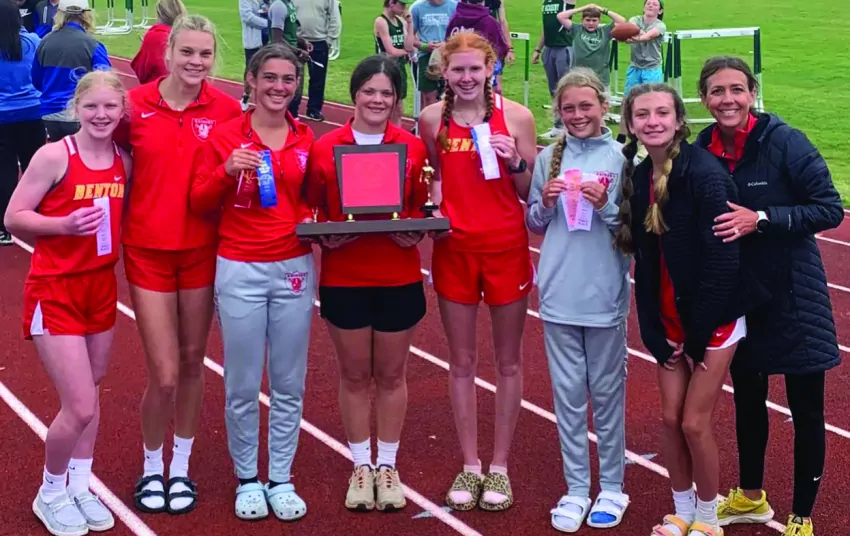 Benton Academy’s girls track team had several athletes advance to the State Track Tournament being held this week at Canton Academy and Jackson Prep. Field events will be Friday at Canton, and the running events will be Saturday at Prep. Advancing for BA are: Kaye Louise Purvis (Shot Put, Discus); Lindsey Hogue (1600m, 3200m, 4x400 relay, 4x800 relay); Isabella Magyar (800m, pole vault, 4x400 relay, 4x800 relay); Ingrid Magyar (800 m, 3200m, 4x400 relay, 4x800 relay); Addy Cader (4x400 relay); and Rylan Gordon (4x800 relay). Pictured above from left are, Addy Cader, Sarah Bailey Jackson, Isabella Magyar, Ella McCain, Lindsey Hogue, Ingrid Magyar, Gordon, and head coach Chastity May.