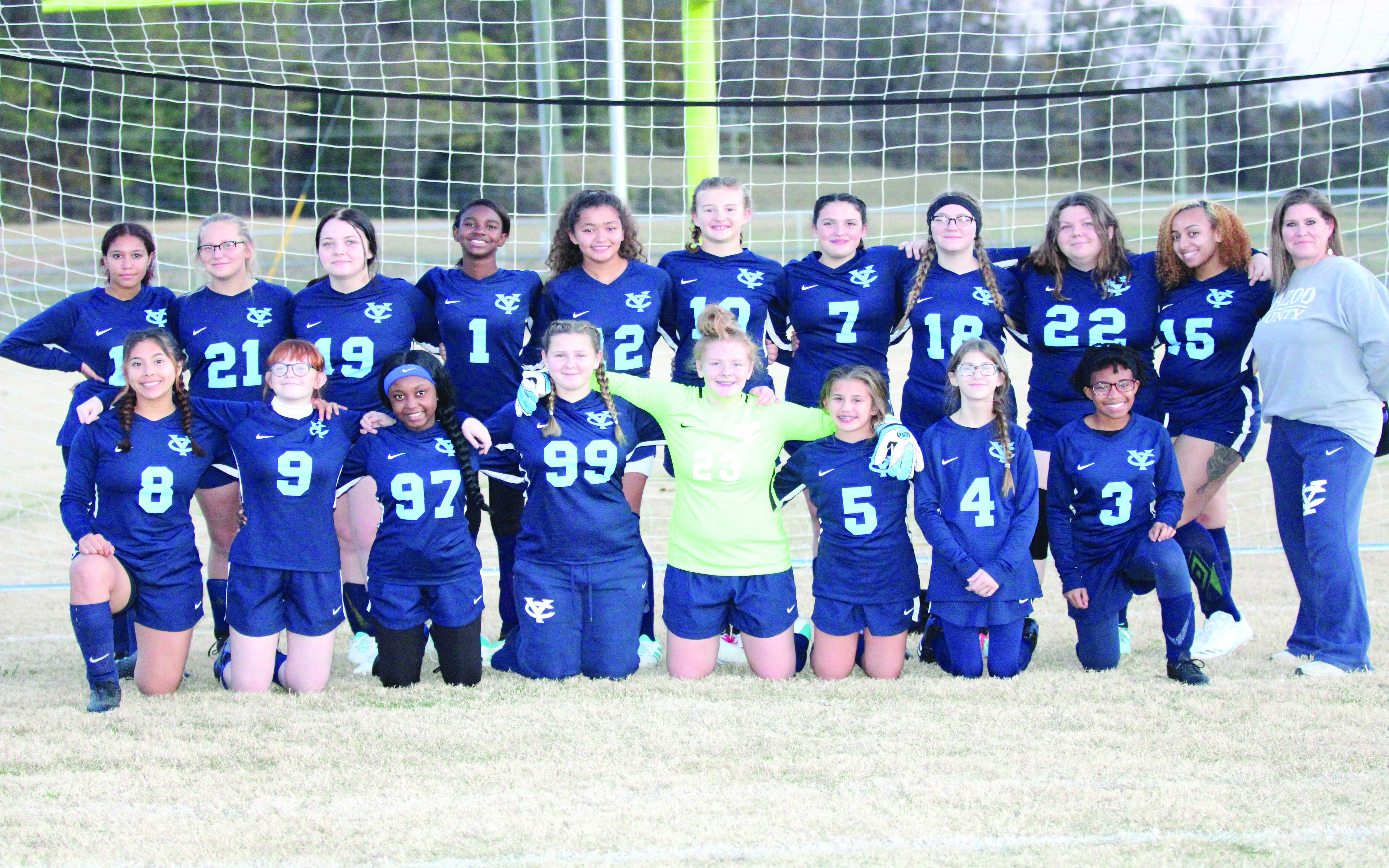 Members of the 2021 Yazoo County Lady Panthers soccer team are, kneeling from left, Elizabeth Solano, Emily Arender, Adriana Washington, Ella Alexander, Kellie Lipsey, Nataliegh Johnson, Kaitlyn McCool, Jordan Wright; standing from left, Juliet Collins, Ryleigh Sudbeck, Ella Grace Chisim, Kelsey Dorsey, Anna Kiley Leal, Lily Kate Andrews, Anna Kate McGraw, Kassidy Henson, Abigail…