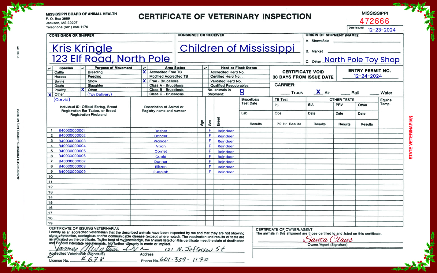 Today, the Mississippi Board of Animal Health (MBAH) issued a certificate of veterinary inspection to Santa Claus of the North Pole, permitting Mr. Claus’ reindeer entry to the state of Mississippi for an “annual business trip” the night of Christmas Eve, December 24.