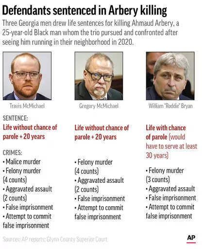 BRUNSWICK, Ga. (AP) — Three white men convicted of murder for chasing and killing Ahmaud Arbery were sentenced to life in prison Friday, with a judge denying any chance of parole for the father and son who armed themselves and initiated the deadly pursuit of the 25-year-old Black man.