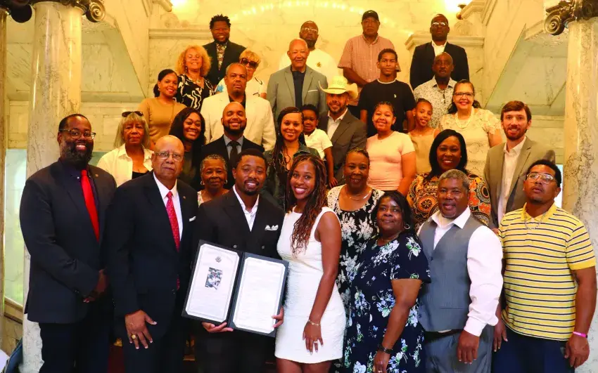 Philadelphia Eagles running back and former Yazoo County High School quarterback Kenneth Gainwell accepted Senate Resolution 60, from Senator Joseph C. Thomas Sr., Senator Reginald Jackson, and Representative Timaka James-Jones, as he was surrounded by friends and family from Yazoo County, who wished him well.