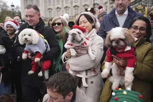 LONDON (AP) — Pooches in pullovers paraded past Buckingham Palace on Saturday for a gathering of dogs in Christmas sweaters to raise funds for rescue charities.