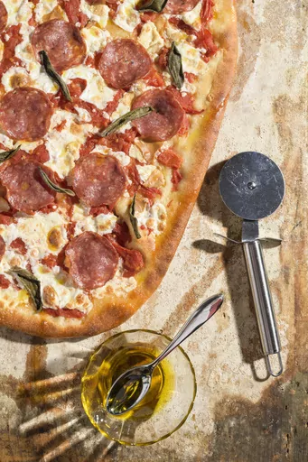 We simply stretch the dough toward the edges of the pan, then top it with crushed tomatoes, cheese, salami and fresh sage. To prevent sticking, oil the baking sheet first with cooking spray, then with olive oil. The oil may seem like an excessive amount, but it adds flavor to the bottom crust and helps it crisp.