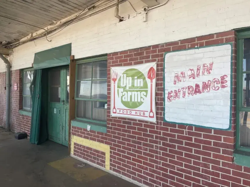 Public-private partners have put around $1 million into the Up in Farms Food Hub, with the goal of getting more locally grown produce into the commercial marketplace. The project, which operated for just one season since it began, is part of the Soul City Hospitality parent company. Chains and a padlock held the door to the building closed on Oct. 7, 2021. Credit: Anna Wolfe, Mississippi Today