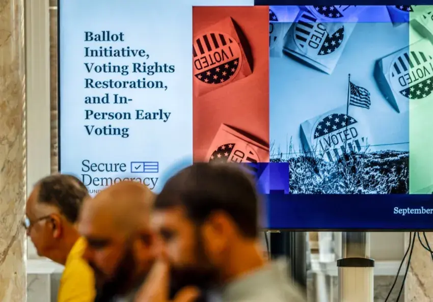 Members of the House Select Committee on Voting Rights listen as Samantha Buckley, director of policy for the Secure Democracy Foundation, presents during the committee’s first meeting at the Mississippi Capitol in Jackson, Miss., on Thursday, Sept. 11, 2025. The committee will consider restoring voting rights for people with felony convictions, reinstating the ballot initiative and no excuse early voting ahead of the next legislative session. Credit: Eric Shelton/Mississippi Today