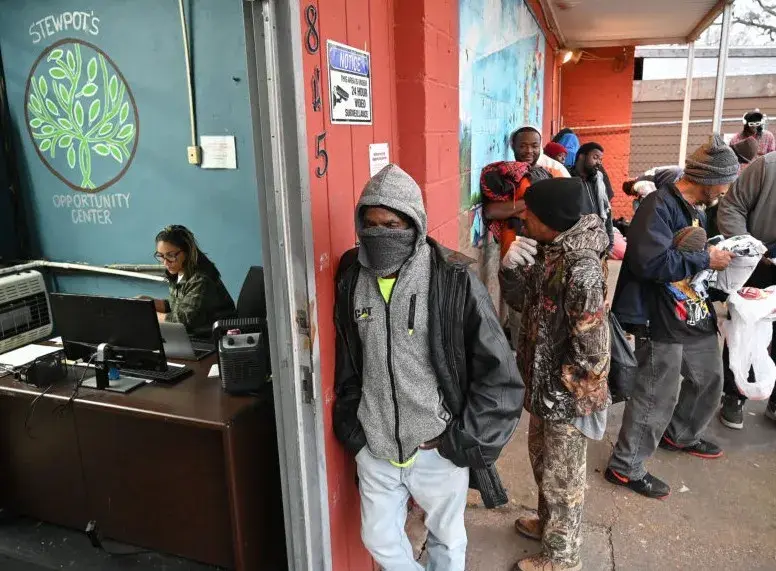 Stewpot Community Services Director of Shelter Services Javonda Stanton, left, checks in people seeking shelter at the Opportunity Center as a winter storm heads to the area, Friday, Jan. 23, 2026 in Jackson, Miss. Credit: Vickie D. King/Mississippi Today