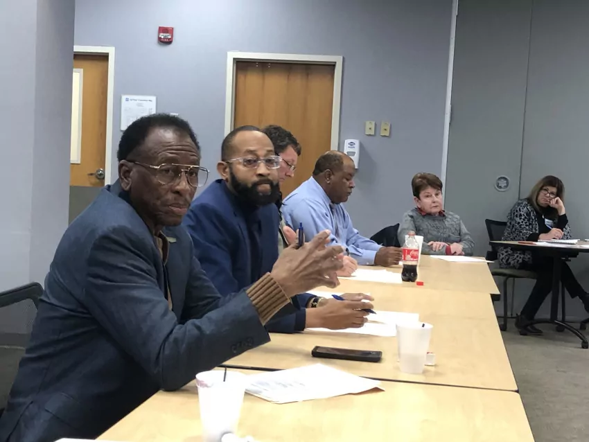 Robert Collins, far left, president of the Leflore County Board of Supervisors, makes a point during Tuesday’s meeting of the Greenwood Leflore Hospital Board. With Collins at the table are other Greenwood and Leflore County officials: from left, county Supervisor Reginald Moore, City Attorney Don Brock, City Council President Ronnie Stevenson and Mayor Carolyn McAdams. (By Tim Kalich)